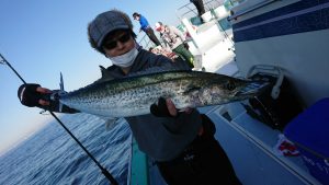 鳥山やナブラは無かったのですが、魚探反応で 海上が穏やかな時間帯に、サワラ、ワラサ、イナダ、シーバスがポツポツと釣れ上がり’ホッ’と出来たのは束の間で徐々に北西風が強まり出してからはイナダ、シーバスが数本追加で終了となってしまいました。