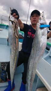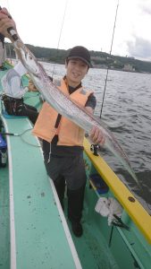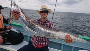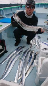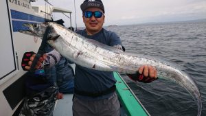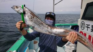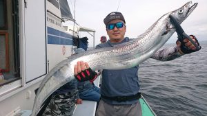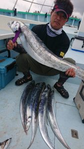 今日も早々に小振りなサイズながらも活性は高く、全体的にアタリが出てくれて、潮の流れが効き出した頃からやっとメーター前後の良型が出始め、時折 F6〜F8の太い大型タチウオがヒットして、船内はヒートアップしてました。