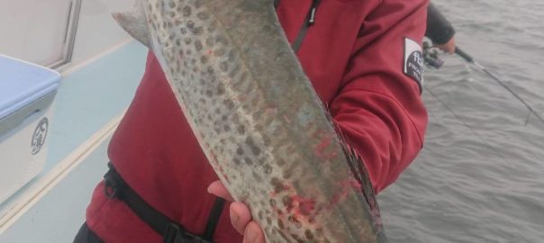 冷たい北東風と小雨で終日寒い1日で、ベイト反応は多く見られたもののサワラの活性は上がらず厳しい状況の中でしたが、ご乗船の皆さん諦めすに頑張って頂きました。