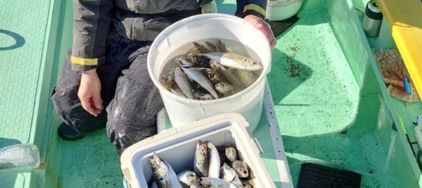 連日の強風で底荒れしたのか白く濁った潮でなかなかアタリが出せませんでしたが下げ潮に変わった頃から活性が上がり、25センチ前後の中アジ主体に活発にアタリが続きダブル、トリプルと連発有り、終了まで好調に釣れました。
