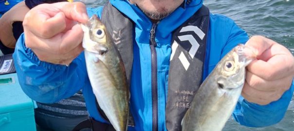 コメント:今日は北風が強くシケ模様の中のスタートになりました。昨日の雨の影響で水温は3℃以上も下がりましたが今日も開始の1投目から型を見られて、上げ潮の時間帯はポツポツと釣れてましたが下げ潮に変わると雨水の流れが一気に出てきて水深10メートルの浅場でも釣りずらいくらい速い流れになりアジも昨日の様に素直に口を使わなくなってしまいました。