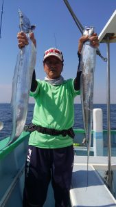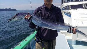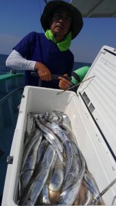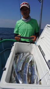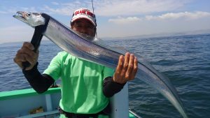 他地域の方には申し訳ない位に被害の少なかった台風5号の影響なのか、タチウオの活性は大変良く、お客様8人様でしたがアタリはしばらくの間続いてくれました。後半もアタリは有りましたが、いかんせん予報通り朝から蒸し暑さは厳しく途中休憩に入る方も目立ち、本日は若干早上がりさせていただきました。