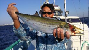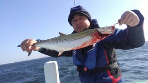 後半から、やや強い風も勢いが弱まりポイント移動して、サワラの1匹目をキャッチした武蔵野市の町田様が2匹目をキャッチ!。その後はサゴシが追加となり、本日は終了させて頂きました。サワラは5ヒットで2キャッチでした。ご乗船して頂いた皆さんお疲れさまでした。