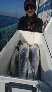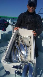 ルアータチウオ船 2018年1月6日タチウオ 釣果 水 温:11.5℃ 釣り場:走水沖 大きさ:81~122cm 匹 数:8~19匹 竿 頭:千葉市の加藤さま コメント ここ数日の釣果の悪さか、本年のチャレンジャーは5人様でした。 しかし、今日はルアータチウオ復調の兆しで、19匹,18匹,17匹,13匹,8匹。トップの加藤さまは、122cm ,108cm の大型タチウオ混じりの良型揃いで、まだまだ大型タチウオは狙えそうですね‼。 明日も出船❗お待ちしてます‼ 共有:Tweet 関連