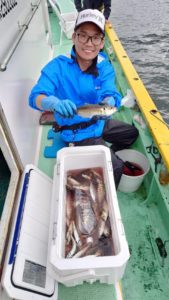 コメント:今日は浅いポイントからのスタートでしたがアジの活性高めで小〜中型が混じってアタリが続いて、ダブルも多く好調に釣れました。