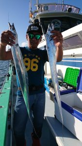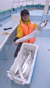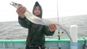 雨模様での出船で、5人様乗船してくれました。釣れ始めはポツポツとテンポ良くヒットしたものの長続きは無く、暫くはタチウオの活性は上がらず時折ヒットはしましたが、我慢の釣りとなってしまいました。