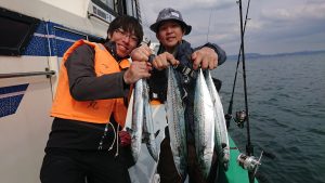 コメント : 昨日の午後、良かったポイントから狙いましたが今日は数匹釣れただけで後が続かず、僚船から好調の連絡が入り、ポイントを大きく移動しました。