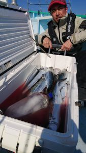 今日は他魚も多くまじり、100〜114cmのタチウオが船中10本2本キャッチは3人。千葉市の伊達様はマダイの4.9kgをキャッチ❗。