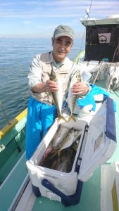 今日も朝イチからシーバスにイナダまじりの活性は高く期待のサワラのヒットは今一つでしたが、徐々にアタリも出だしてはくれたものの、バレがいつになく多いようでした。ヒットの数は昨日よりも多かったので船中合計は22本と昨日を上回ってくれて、トップの田辺様はダントツでミノーとシンペンのみの釣果ですよ。今日はサイズも良く3kg越えのサイズも多く見られ、4.4kgが船中2本キャッチ❗。