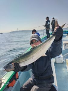 前半は南西の風が強目に吹いてウネリが高くほぼアタリが出ませんでしたが、風向きが北寄りに変わって少しずつウネリがおさまり始めてからやっと1つ目のサワラをキャッチ出来ました。